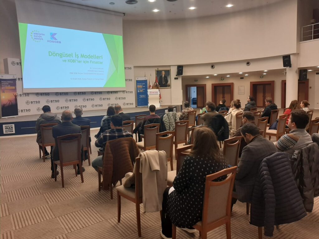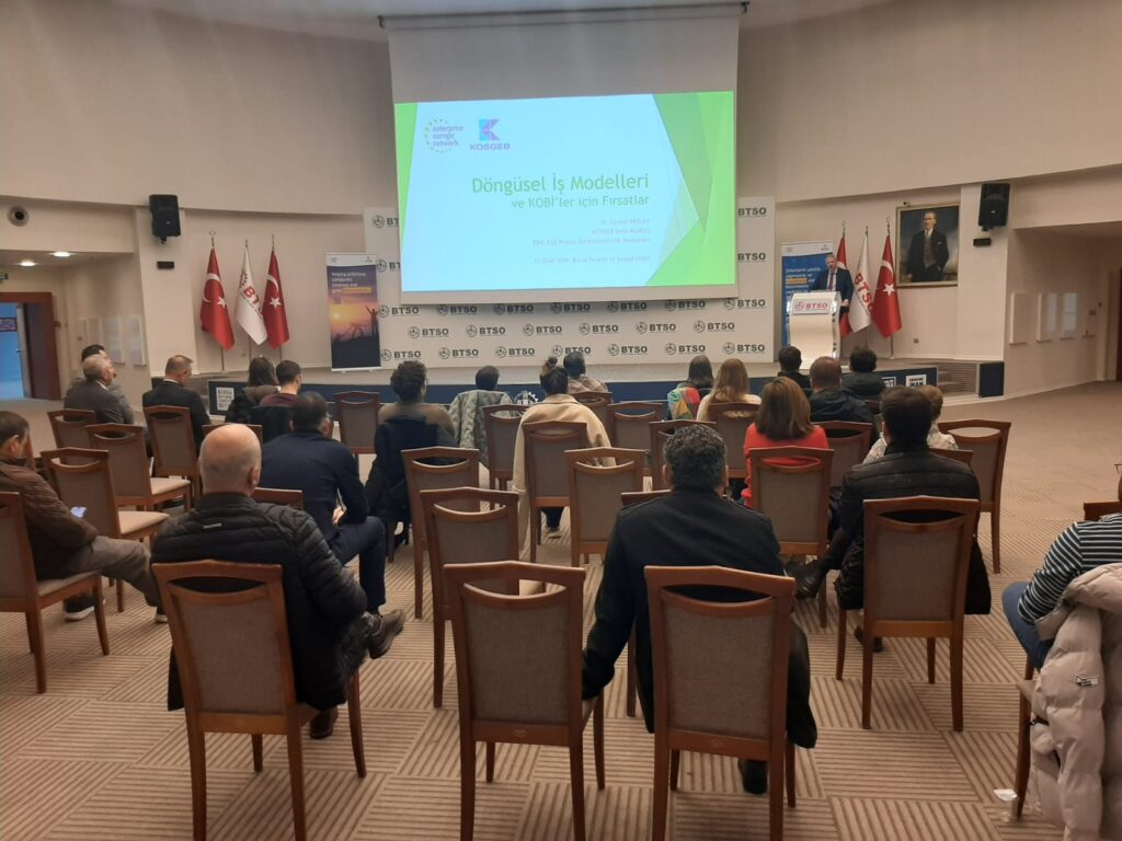 Sürdürülebilir kalkınma hedefleri doğrultusunda iş dünyasının dönüşüm sürecine katkı sağlamak amacıyla KOSGEB, Enterprise Europe Network (EEN) ve Bursa Ticaret ve Sanayi Odası (BTSO) ile İnegöl Ticaret ve Sanayi Odası (İTSO) iş birliğinde “Döngüsel İş Modelleri ve KOBİ’ler için Fırsatlar” başlıklı seminerler düzenlendi.